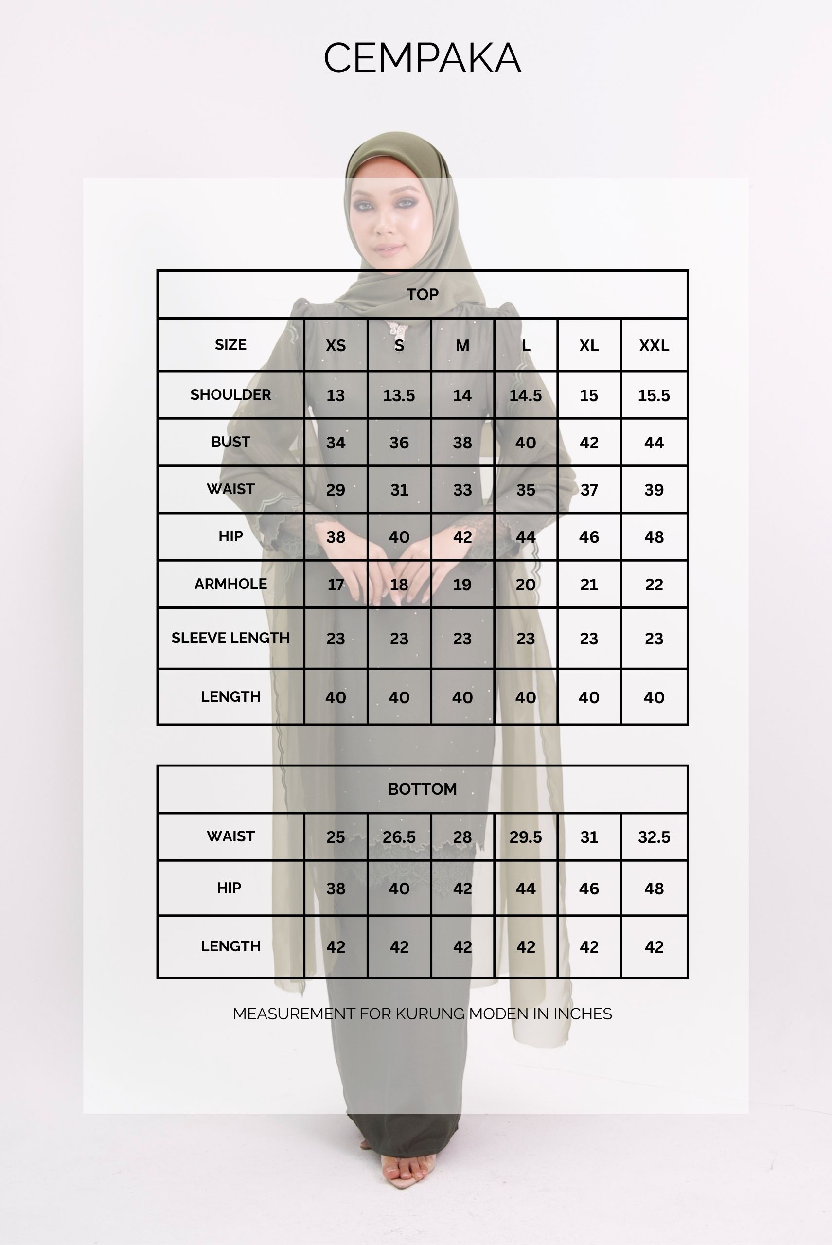 Measurement For Kurung Moden in Inches