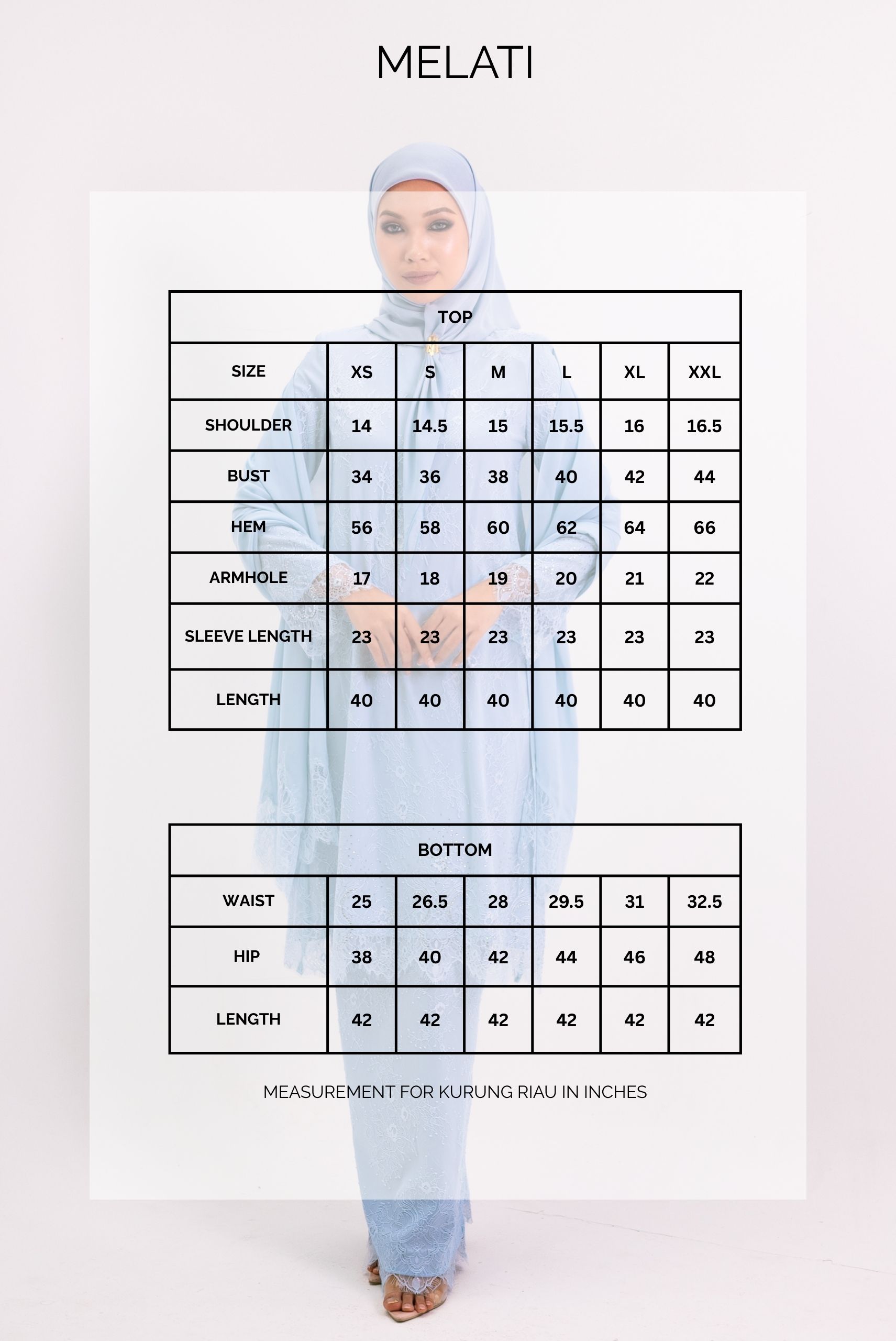 Measurement for Kurung Riau in inches