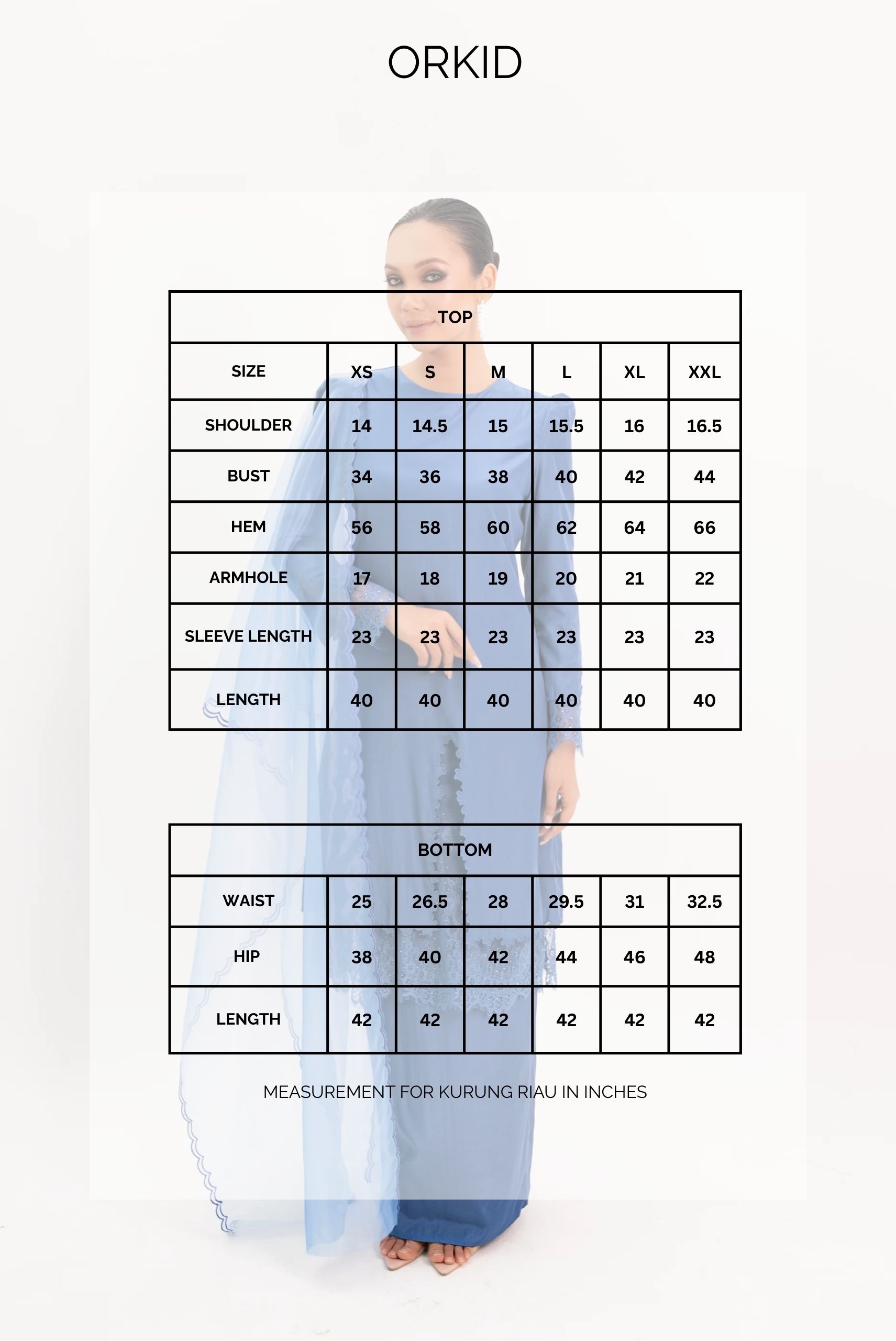 Measurement for Kurung Riau in inches